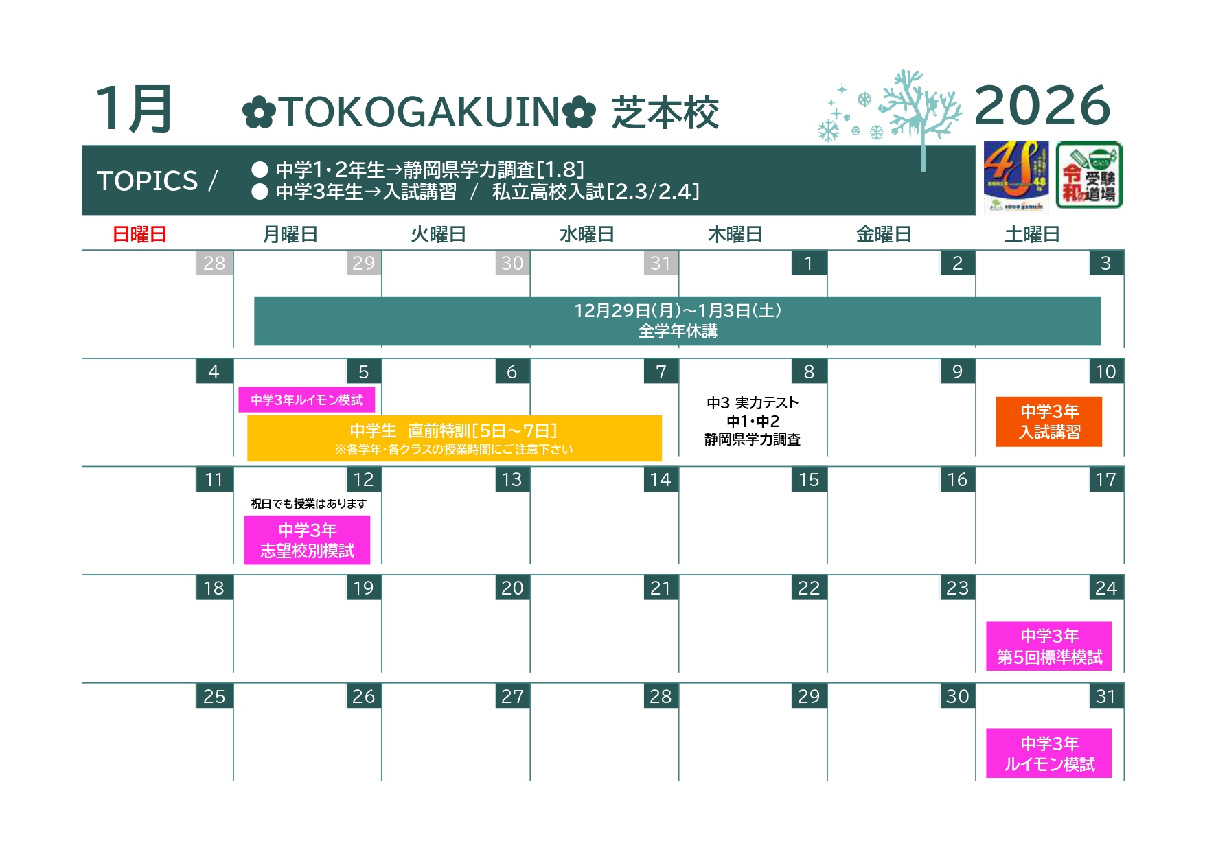 2026年1月の月間スケジュールを掲載しておきます。