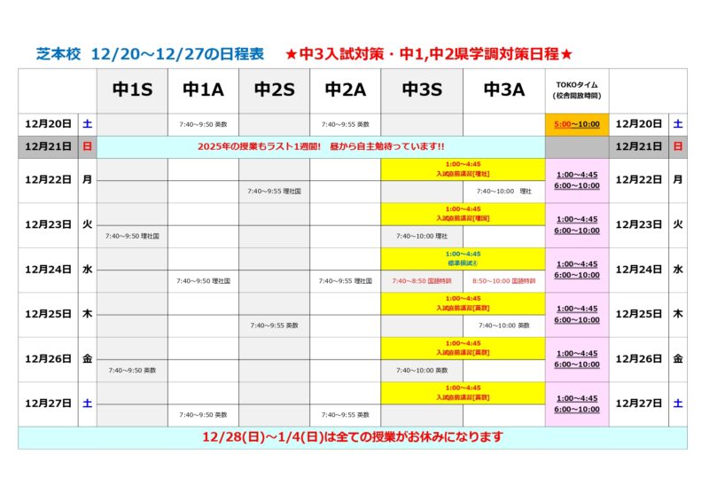 中学1・2年生は1月8日の[学力調査]を目標に走り出します。