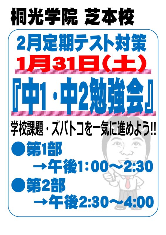 本日、土曜日は『中3ルイモン模試』『中1・中2限定の勉強会』を実施します。