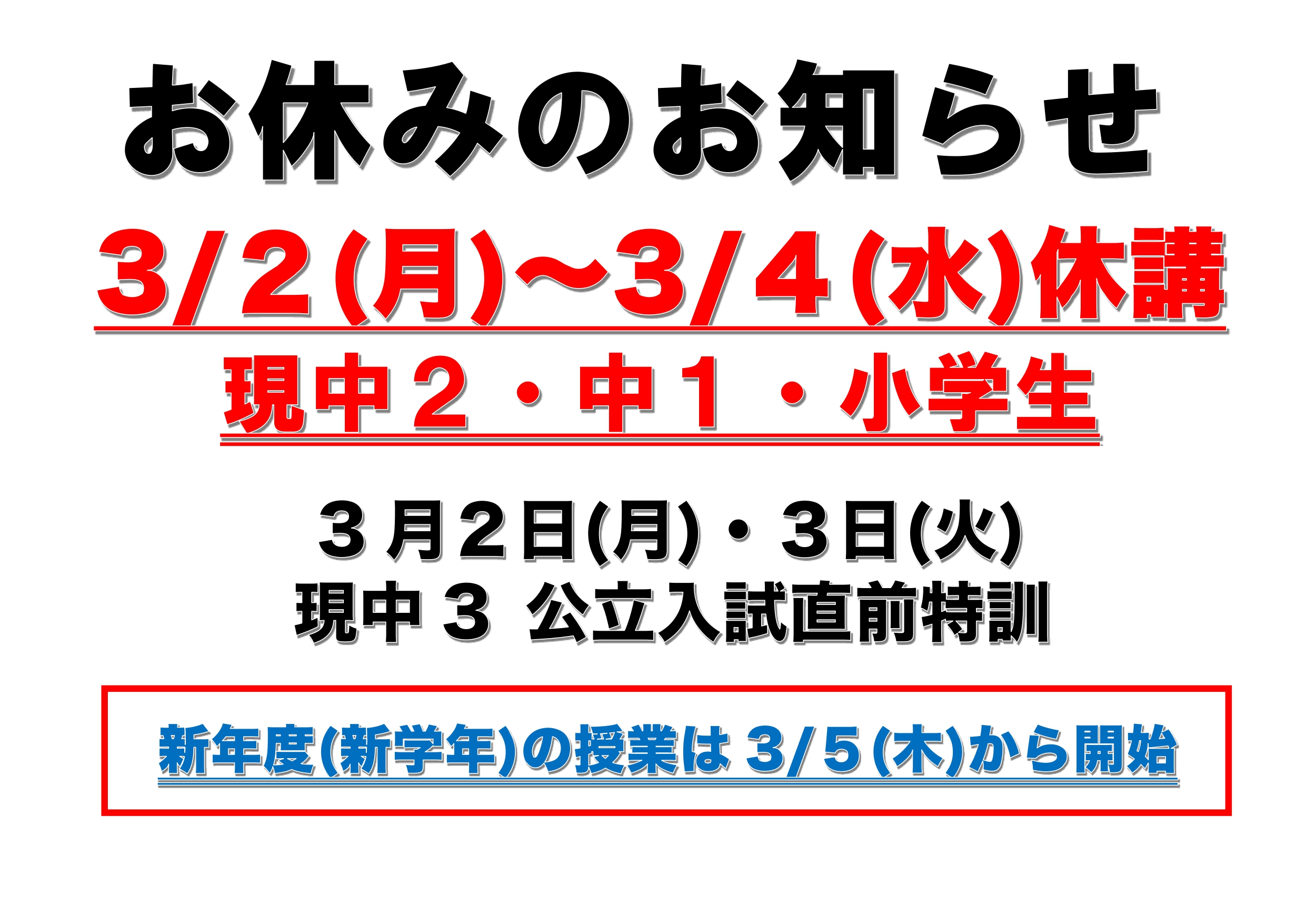 現小学6年生~現中学2年生までのみなさんは3月2日(月)~3月4日(水)はお休みとなります