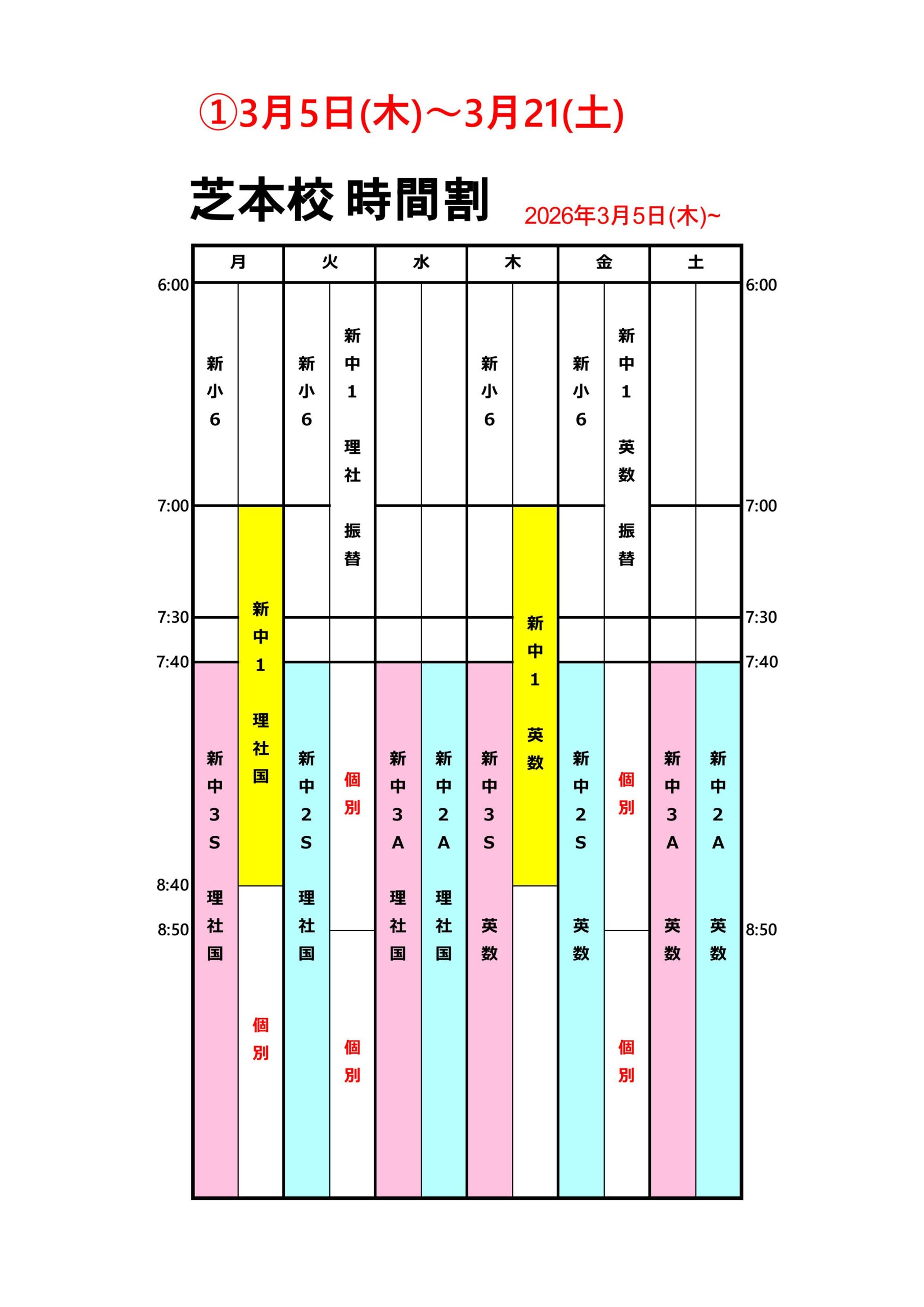 3月5日(木)からの[新時間割]です。