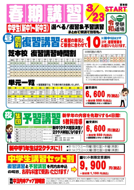 新中1~新中3の春期講習は、なんと個別講習10コマ(新中1は8コマ)と