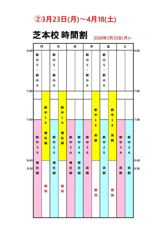 今週3月23日(月)から新中学1年生の時間割が変更となります。
