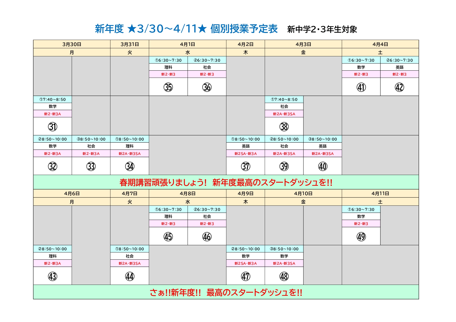 春休み期間中の個別授業は昼個別・夜個別と目いっぱい復習をしていきます。