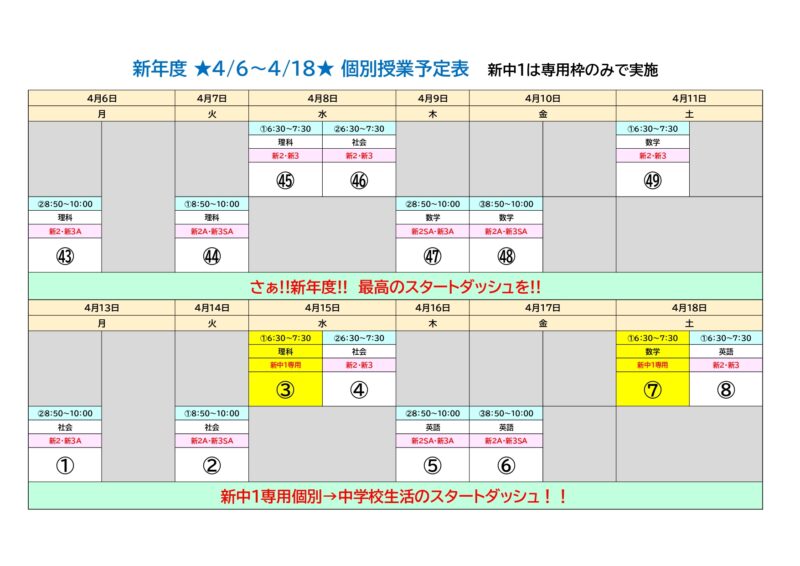 来週までの『夜の個別授業の予定表』を載せておきます。