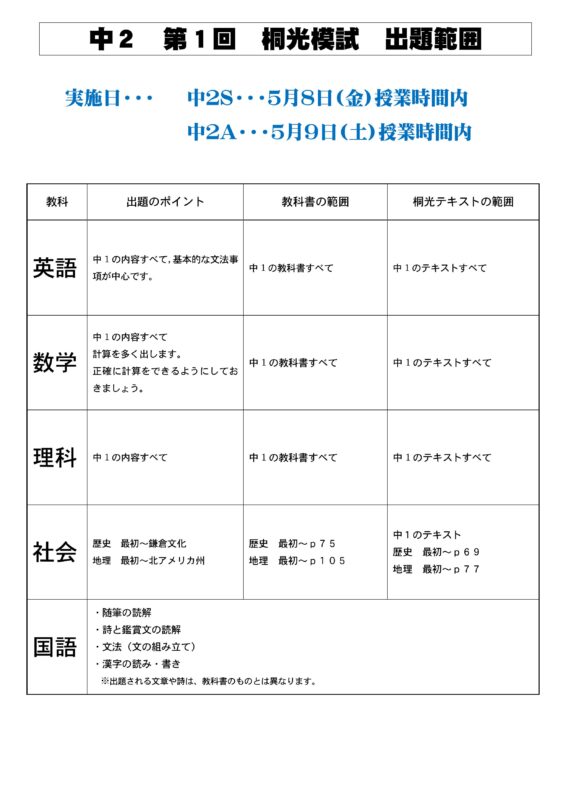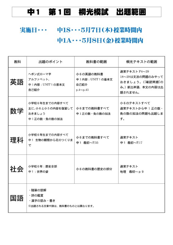 中学1・2年生は今年度最初の桐光模試を実施します。
