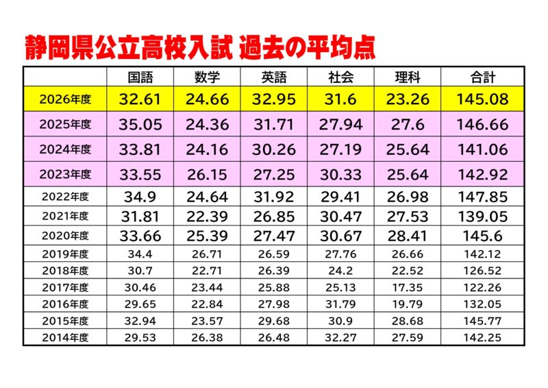 先日、静岡県教育委員会から昨年度の公立高校入試の平均点が発表されました。