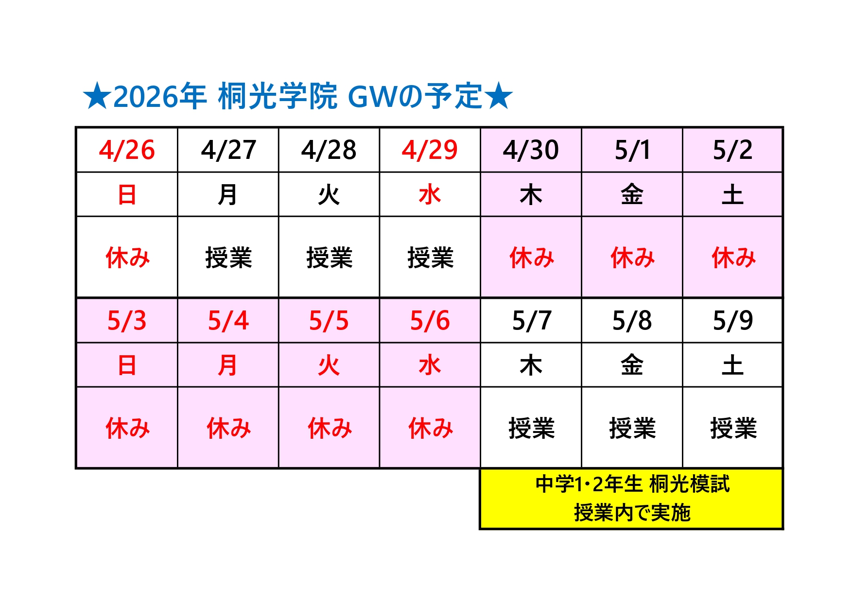 今年度の桐光学院のお休みの予定をお知らせいたします。