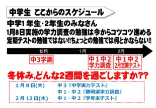 BLOG2025/12/19中学1・2年生 いざっ!…いよいよ中学1・2年生の冬の講習がスタートしました。 この冬の講習は1月8日の学力調査に向けた『スペシャ…