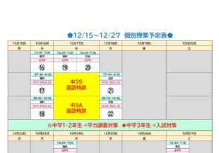 BLOG2025/12/1812/18~27 個別日…今週からの個別予約表を載せておきます。 ここからの目的は… ①入試[中3]に向けての勉強 残り3ヵ月!志…
