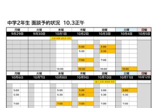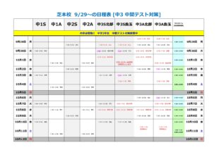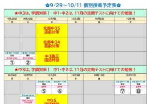 もっと見る今週後半からの個別日程を載せておきます。 10月下旬になると、期末テスト対策に入っていきますので、 中1…