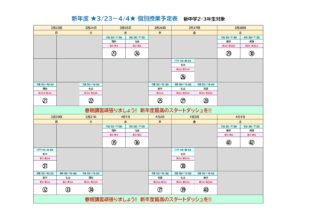 BLOG2026/03/233/23~4/4 個別日…[3月23日から]の個別日程表を載せておきます。 春休み期間中の個別授業は昼個別・夜個別と目いっぱい復習…