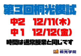 BLOG2025/11/21中1・中2 桐光模試 岩…期末テストが終了しました。 12月に入ると中1と中2は桐光模試を実施予定です。 範囲は今週から発表してい…