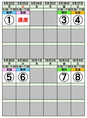 9/24(水),10/1(水),10/8(水)は校舎が開かないため自習もできません。ご理解とご協力をよろしくお願い致します。
