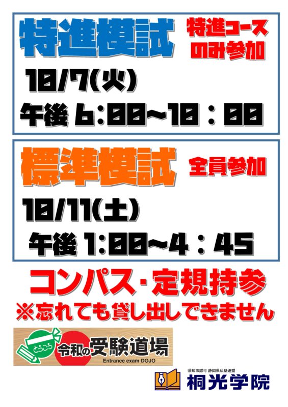 10/11(土)は午後1:00~4:45で全員対象の『標準模試』