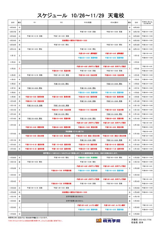 中3にとっては桐光での最後の定期テスト対策となります。対策の時間もできるだけ多くとりました。塾にもどんどん足を運んで悔いのないように頑張ってもらいたいです。