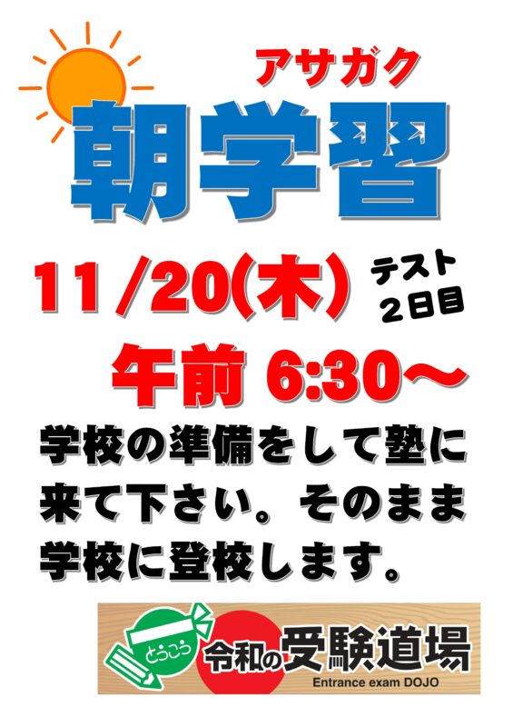 すでにお伝えしている通り,11/20(木)は午前6:30からで朝学習を実施します。