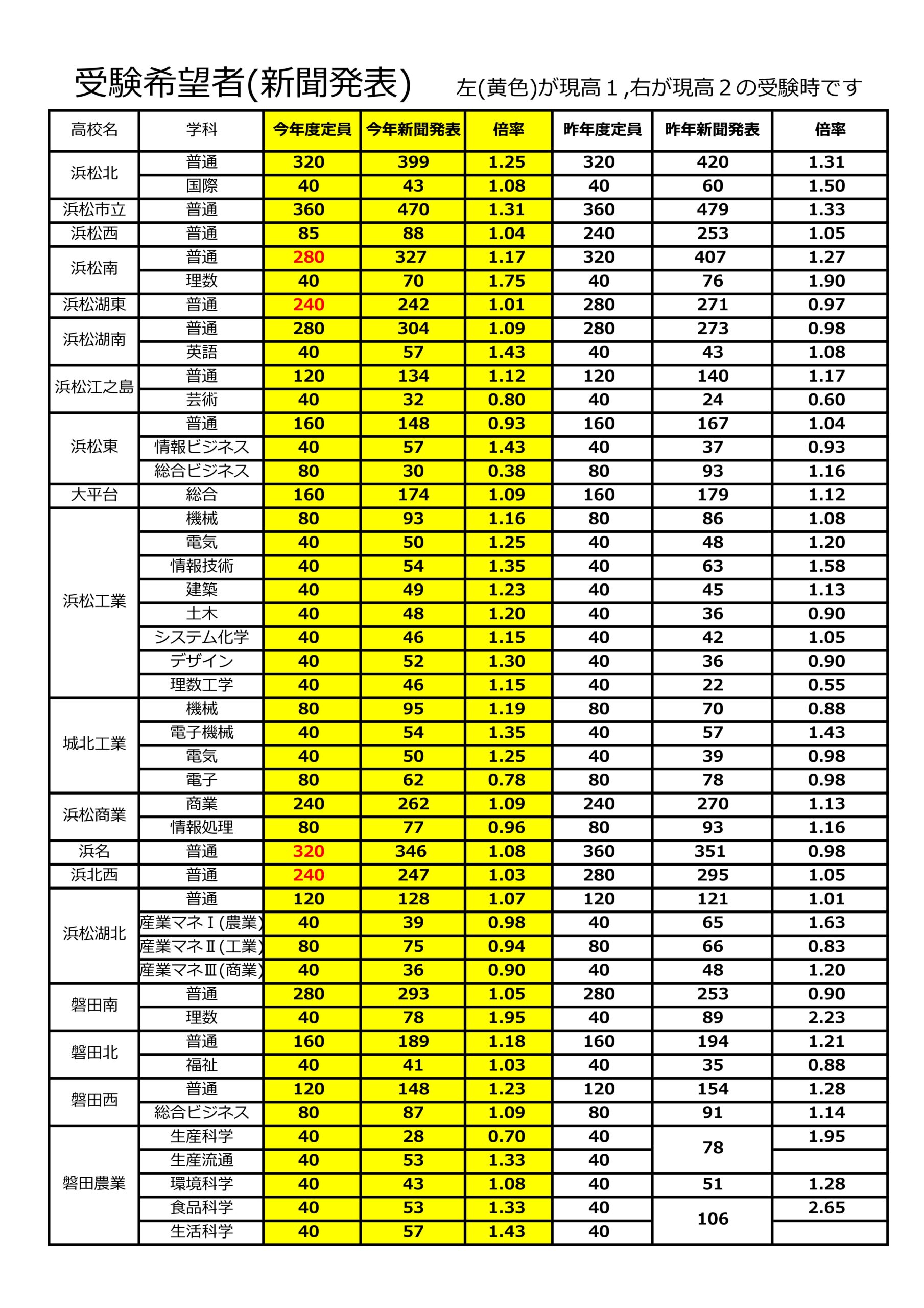 ○現高1(昨年)と現高2(一昨年)が受験したときの受験倍率(新聞発表時)画像データです