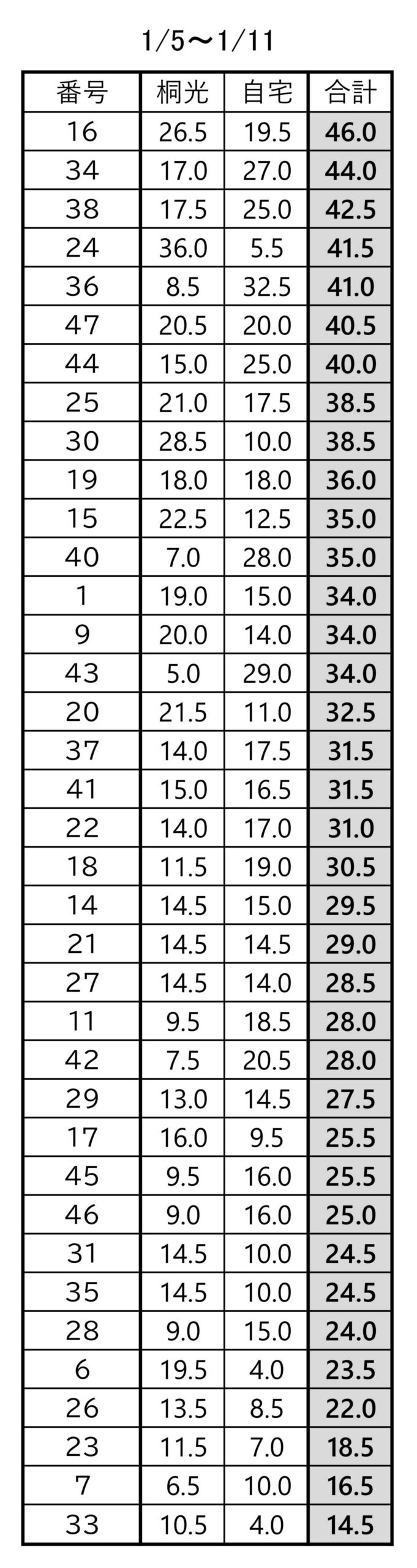 受験生の1/5から1/11の勉強時間になります。