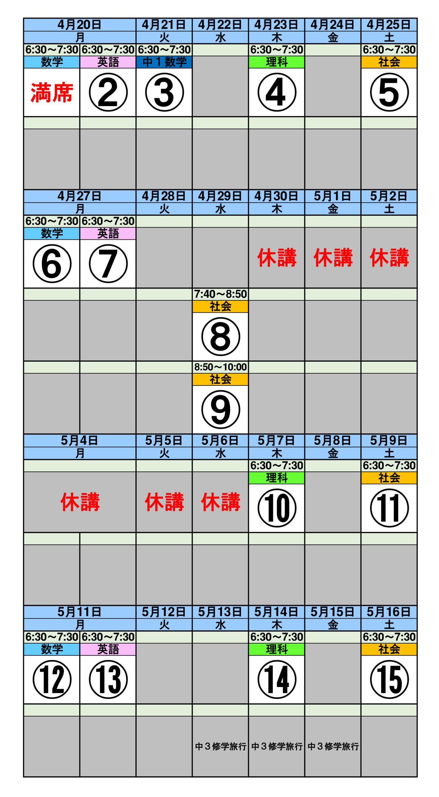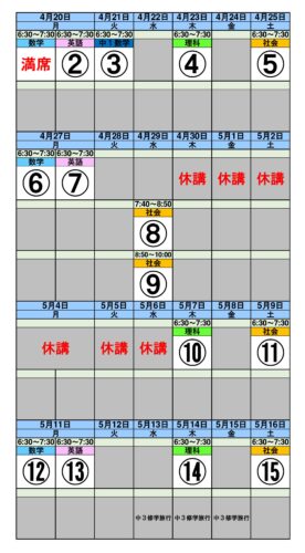 4/20から5/16の個別授業です。