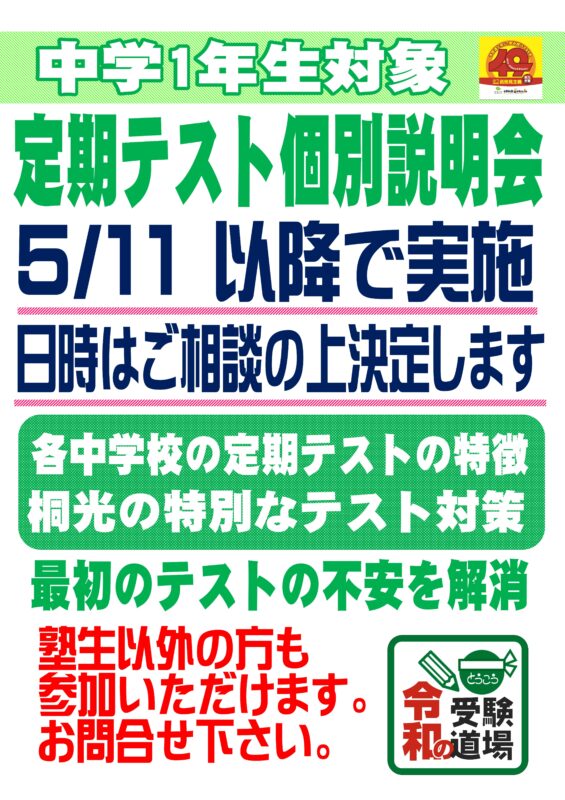 中1を対象に定期テスト説明会を個別の面談形式で実施します。