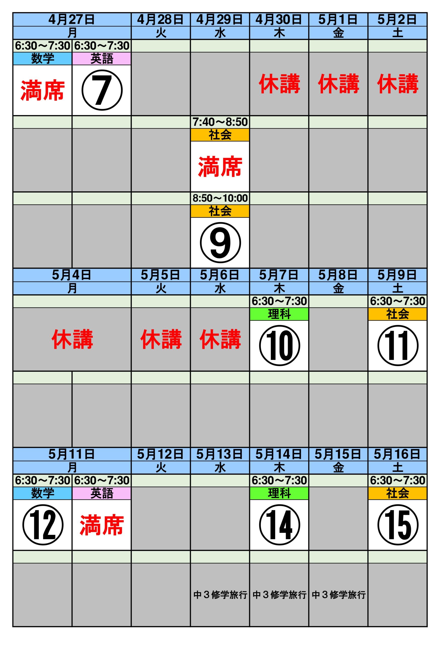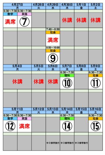 4/27~5/16の個別授業になります。