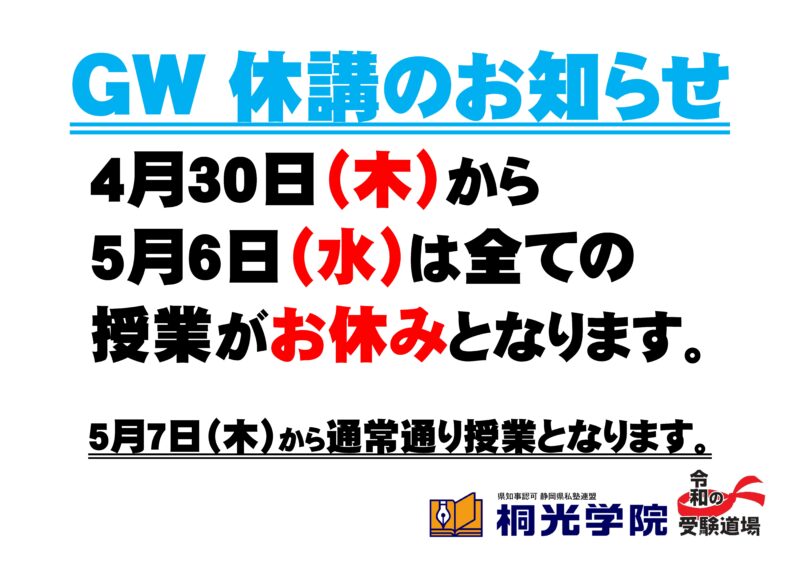 4/30(木)~5/6(水)の期間は全学年お休みとなります。