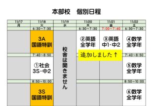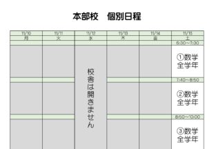 BLOG2025/11/1311/15~11/22の…本部校の個別授業が再開します! 早速、今週末の土曜日(11/15)に数学の個別授業があります。 東部中・…