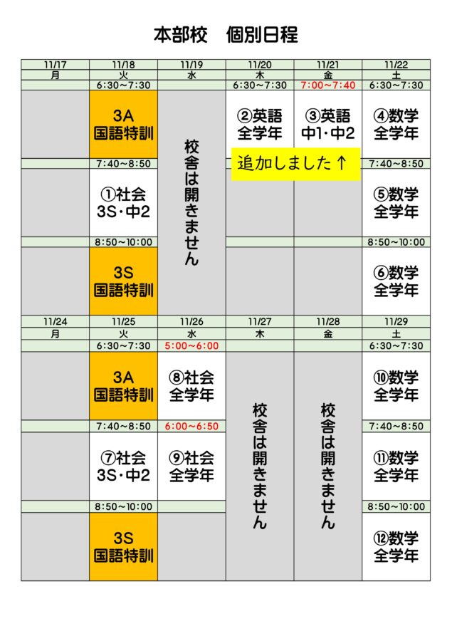 11/20(木)・11/21(金)に英語の個別授業を追加しました。