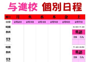 BLOG2026/02/022/2(月)~2/14(…こんにちは、英語担当の柴田です。今週は中1、2のみなさんは学年末テストがあります。学年のよい締めくくりが…