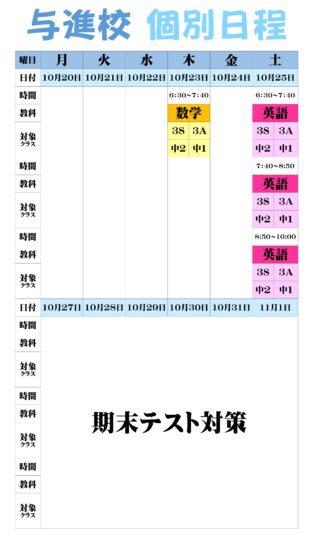 こんにちは、英語担当の柴田です。来週からいよいよ期末テスト対策が始まります。特に中3生のみなさんは内申点のかかる大事なテストです。1コマ1コマを大事に受講しましょう。