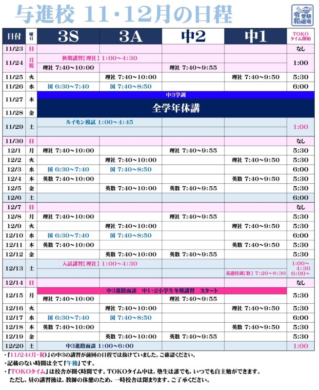 全学年で木・金は休講となります。土曜日には中3の模試でスタートします。