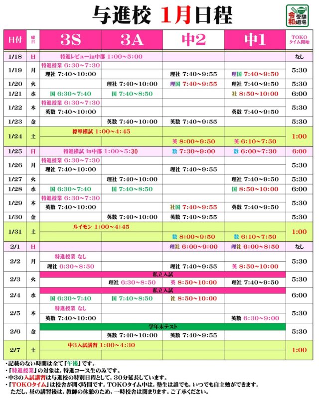 入力ミスで今週の「今週の予定」がアップされませんでした。今週末は.中3は標準模試に特進模試,中1・2は土日にしっかりテスト対策があります。お待ちしています。稲田