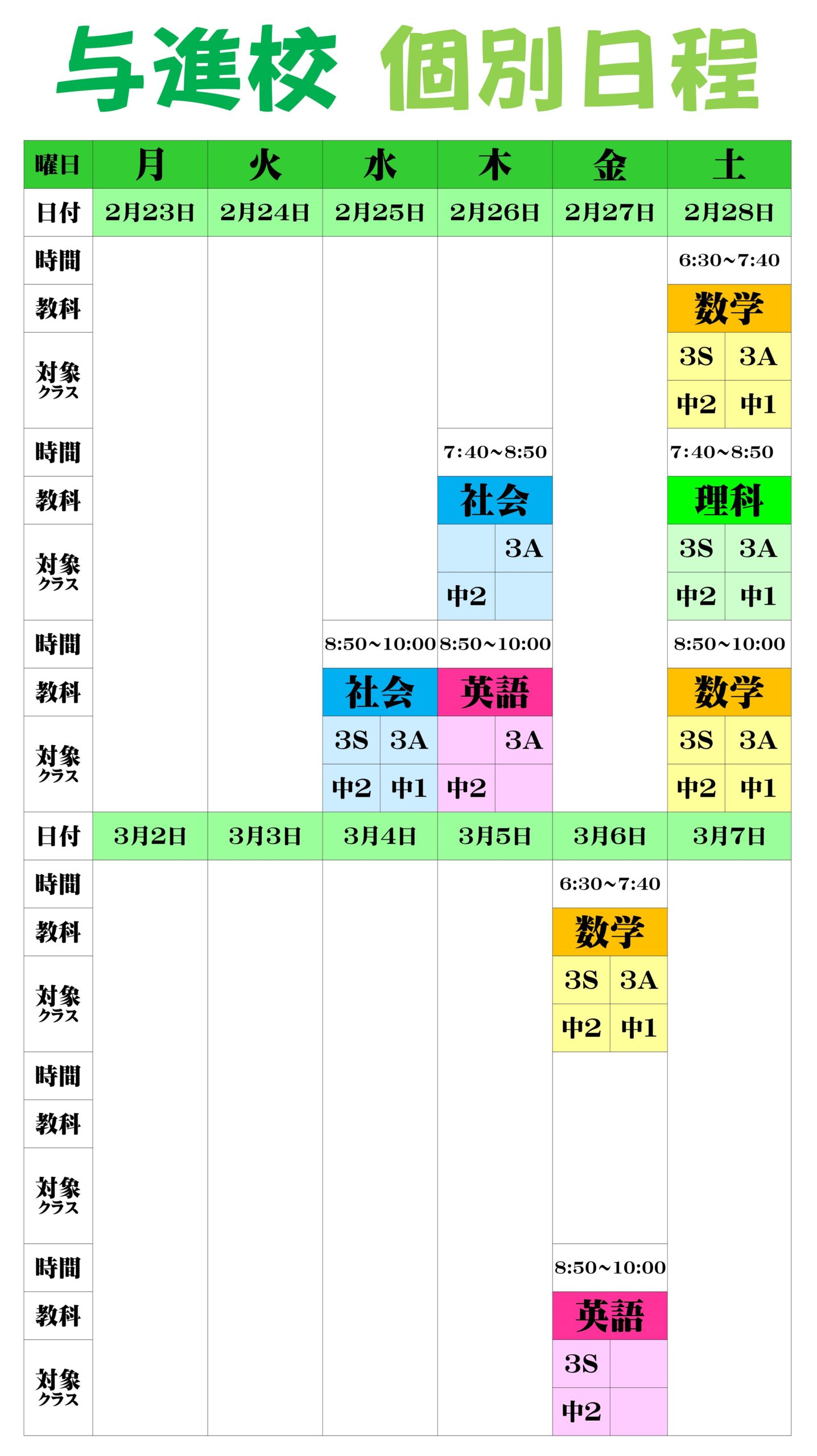 こんにちは、英語担当の柴田です。3/5(木)から新学年になります。その関係で、個別授業のクラスの記載も新学年のものとなりますので、ご注意ください。