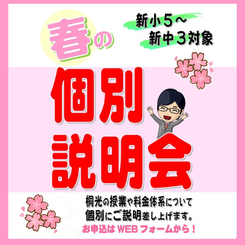 この春、進級・進学を機に学習塾をご検討中の方を対象に桐光の授業等のシステム・料金体系などをご説明する個別説明会を随時実施しています。説明会の後、1週間の無料体験授業にもご参加いただけます。