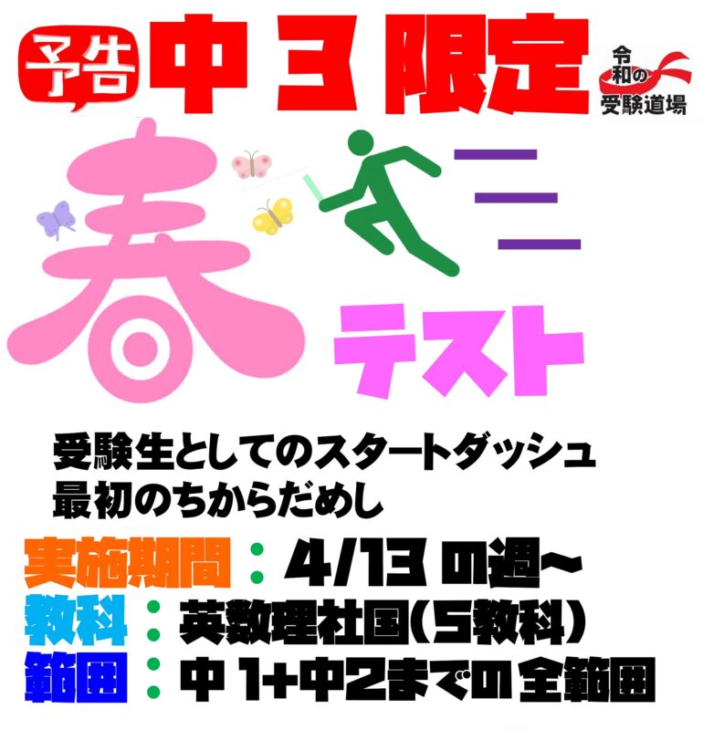 新受験生にとって初めての本格的な模試タイプのテストです。どの教科,どの範囲だってかなり忘れています。この春の頑張りが確実に結果につながるはずです。
