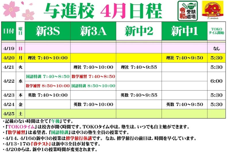 新中1が本格的に夜の時間になります。不安ですか?大丈夫,毎年みんな元気にやっていますよ。私たち教える側としては少し短い授業時間だったので,やっとたっぷり教えてあげられるなとワクワクしています。お楽しみに。