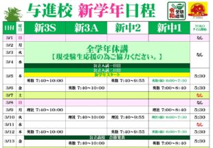 BLOG2026/03/01今週の予定 稲田塾生は,週前半は全学年休講。受験生を応援させていただきます。 週後半は,新学年がスタートします!