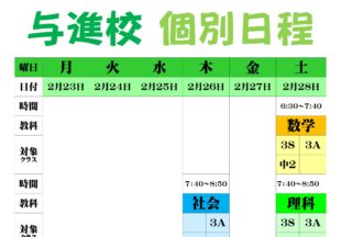 BLOG2026/02/262/23(月)~3/7(…こんにちは、英語担当の柴田です。いよいよ中3生のみなさんもゴールが近づいています。最後まで気を抜かずに頑…